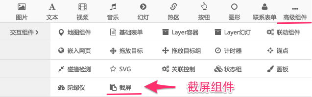 如果要将H5页面上的多个元素,包括图片、幻灯、序列帧、段落组件合成在一张图片上,并保存下来,这就需要 “截屏” 组件了。